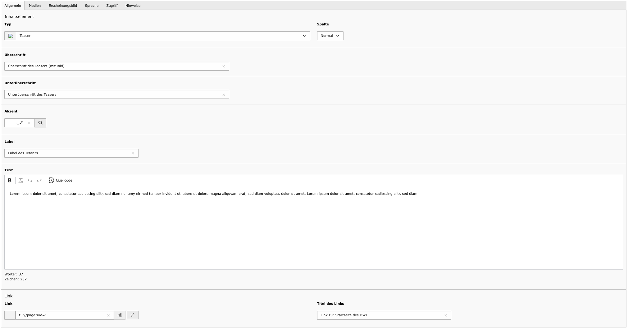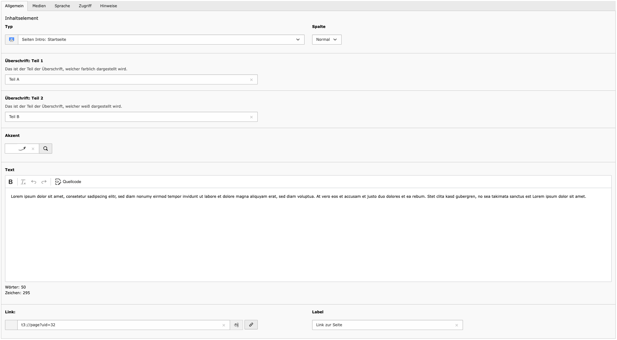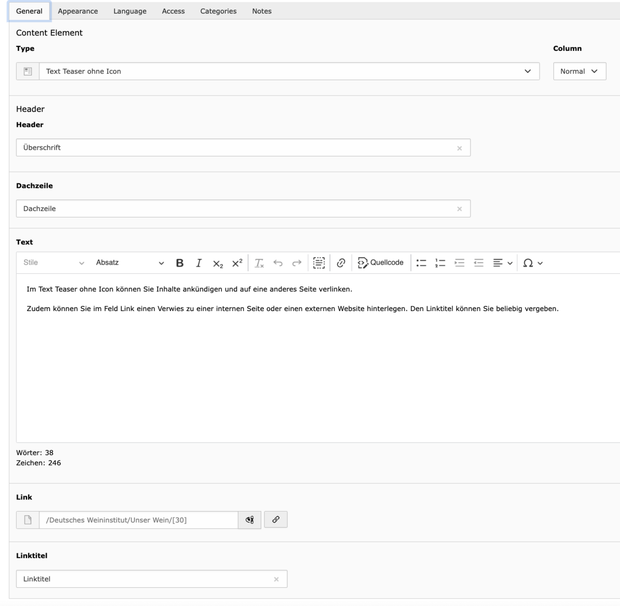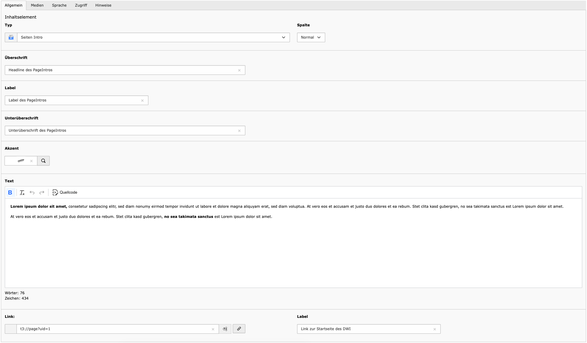 - Text – Der eigentliche Inhalt. Der Text-Editor unterstützt Formatierungen wie Überschriften (H2–H5), Fließtext, Listen und Links