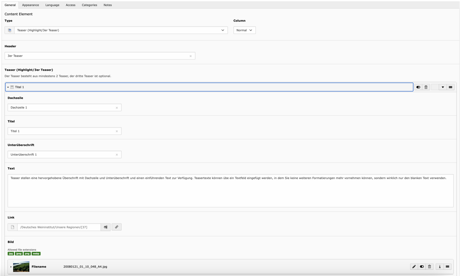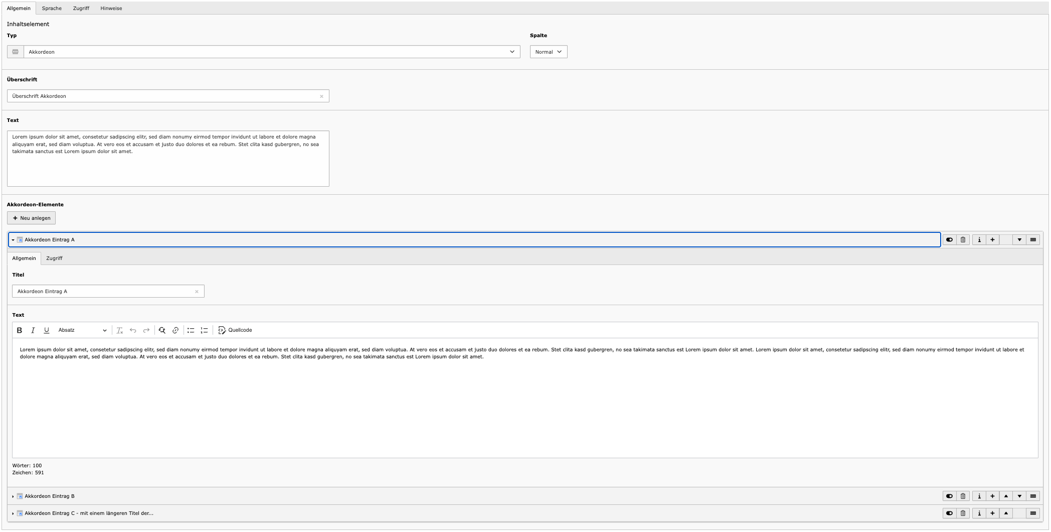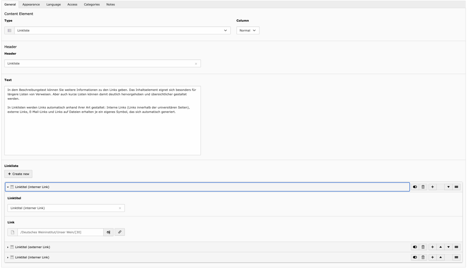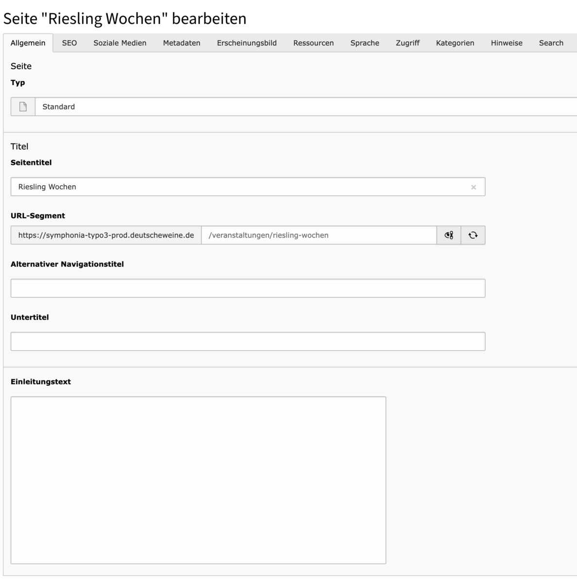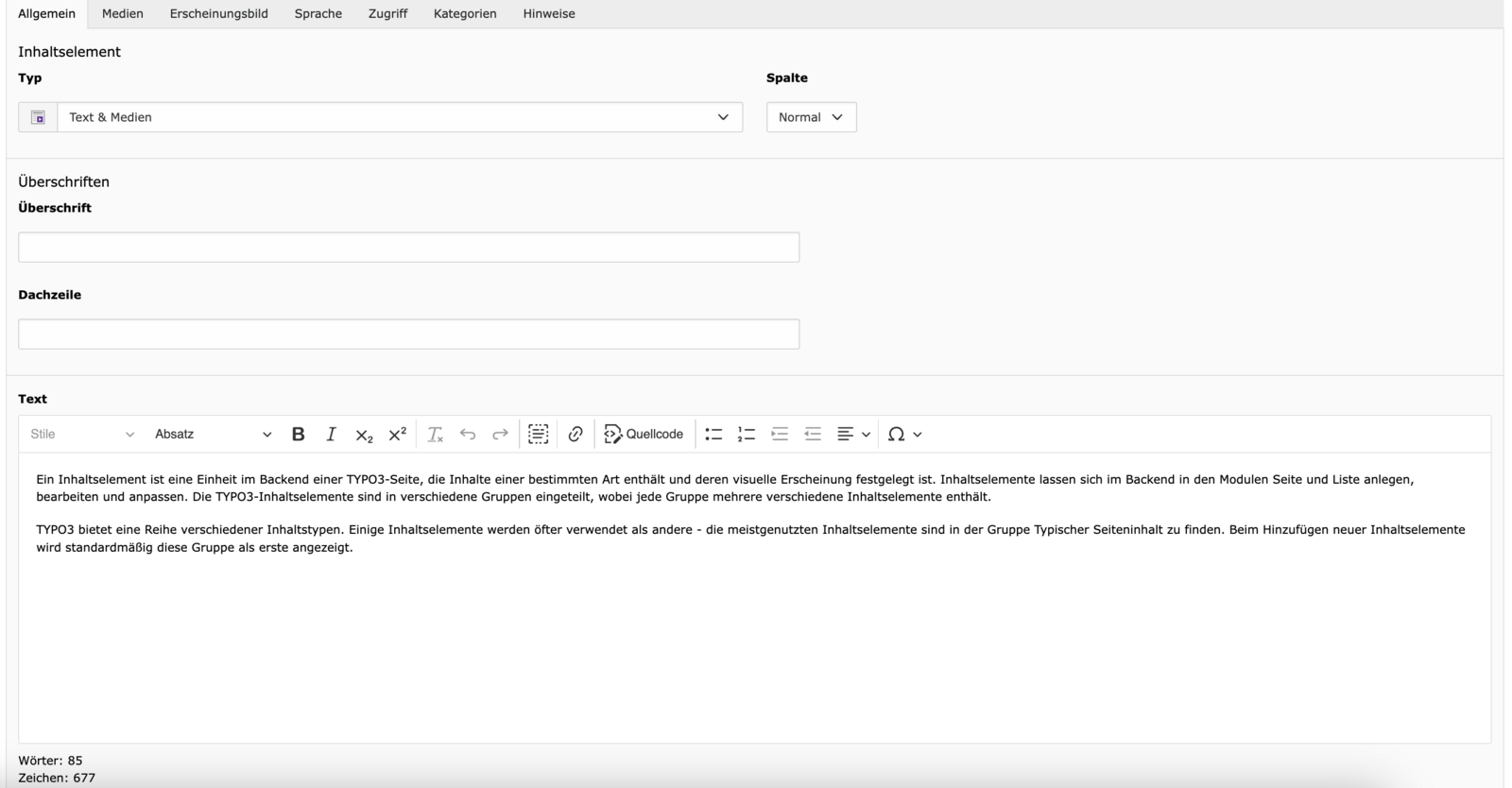 - Text – Der eigentliche Inhalt. Der Text-Editor unterstützt Formatierungen wie Überschriften (H2–H5), Fließtext, Listen und Links