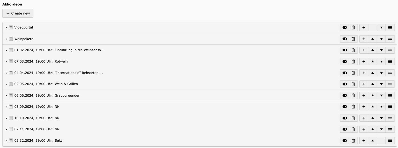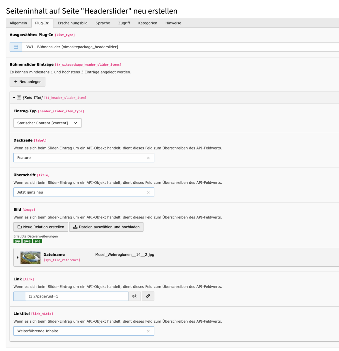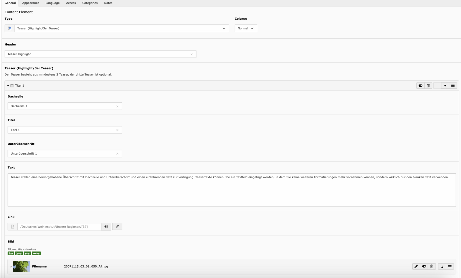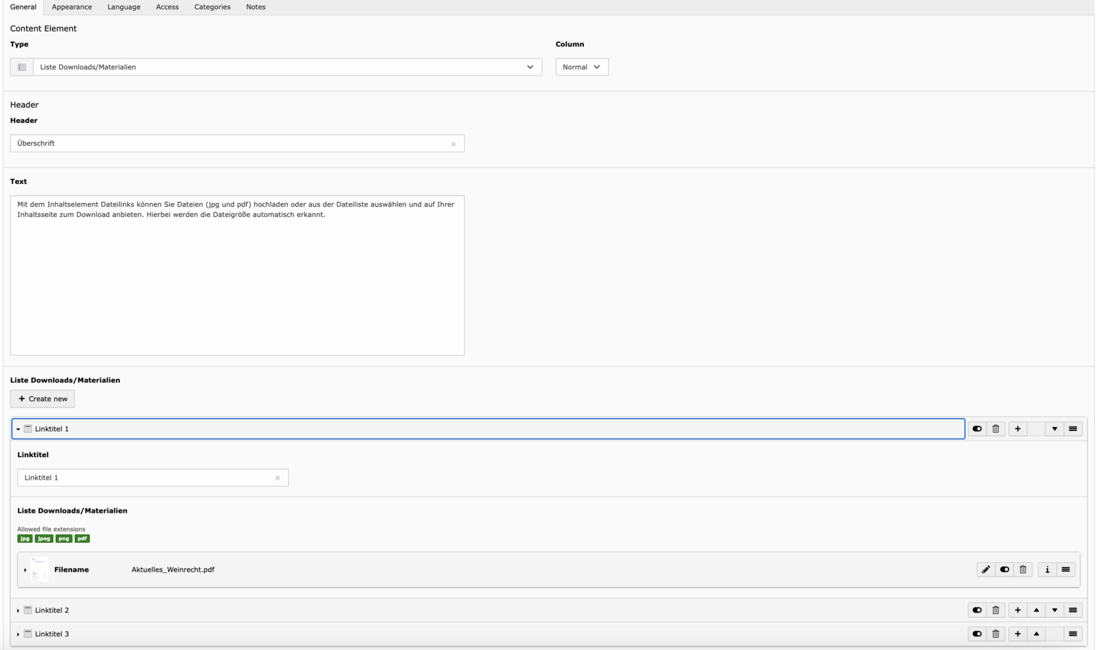 - Text – Der eigentliche Inhalt. Der Text-Editor unterstützt Formatierungen wie Überschriften (H2–H5), Fließtext, Listen und Links