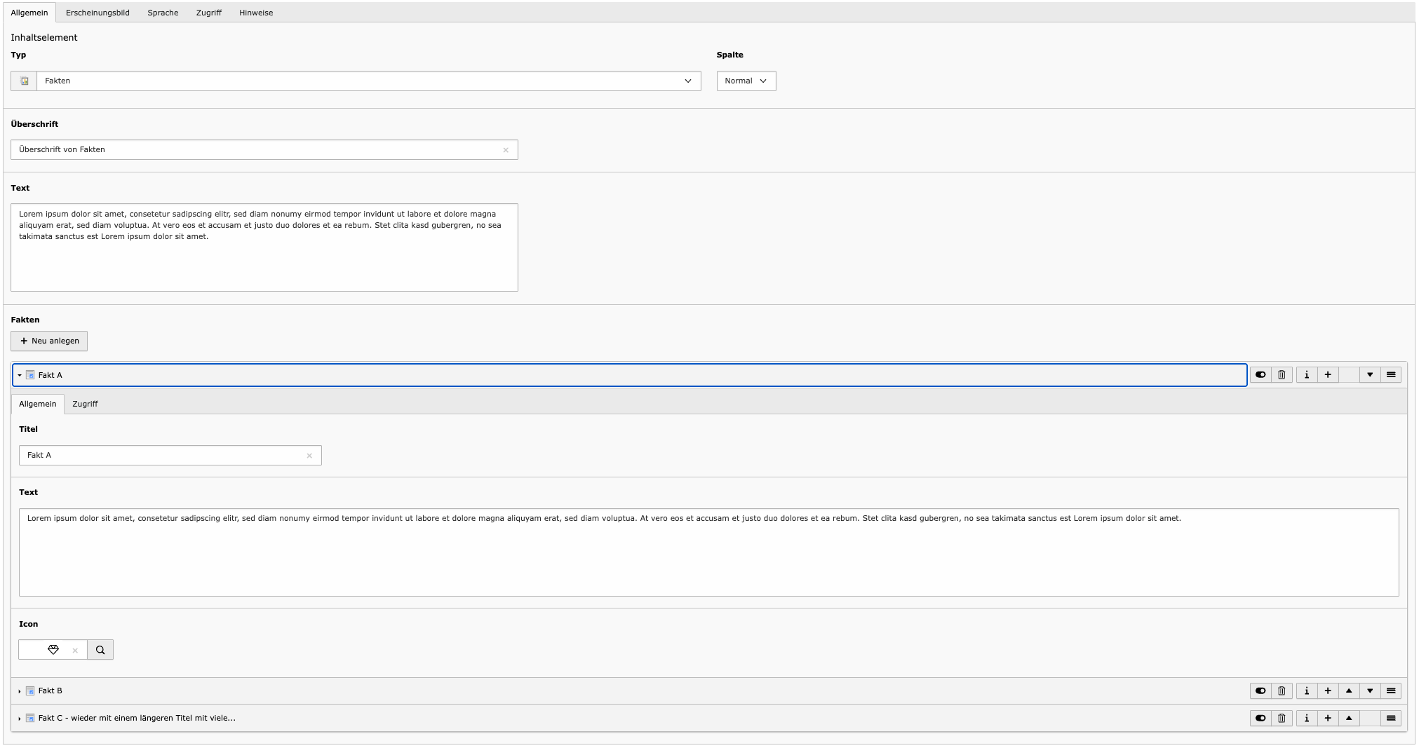 - Fakten-Einträge – Jeder Eintrag besteht aus einem Icon, einem Titel und einem Text. Es können beliebig viele Einträge hinzugefügt werden.