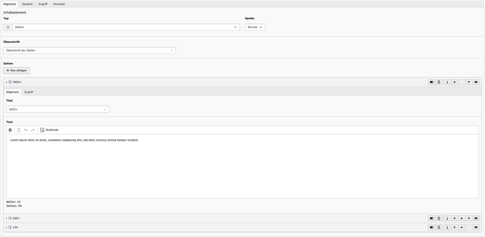 - Zahlen-Einträge – Jeder Eintrag besteht aus einem Titel (z. B. die Zahl selbst) und einem Text (z. B. die Erläuterung dazu). Es können beliebig viele Einträge hinzugefügt werden.