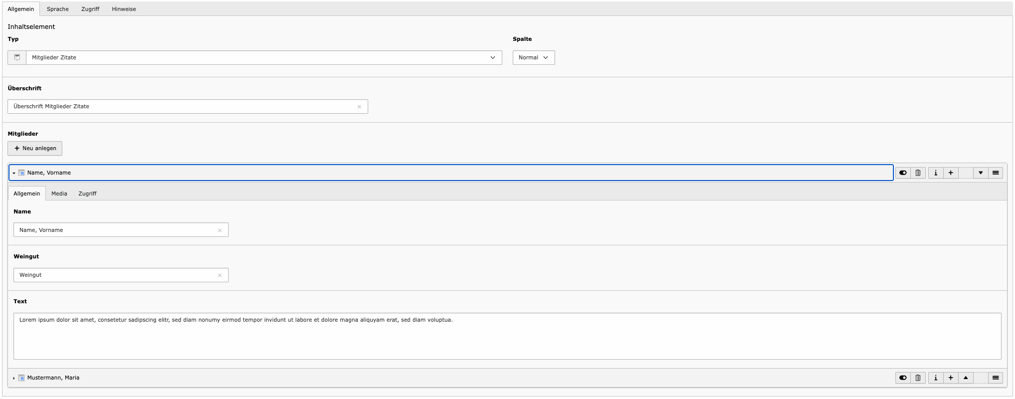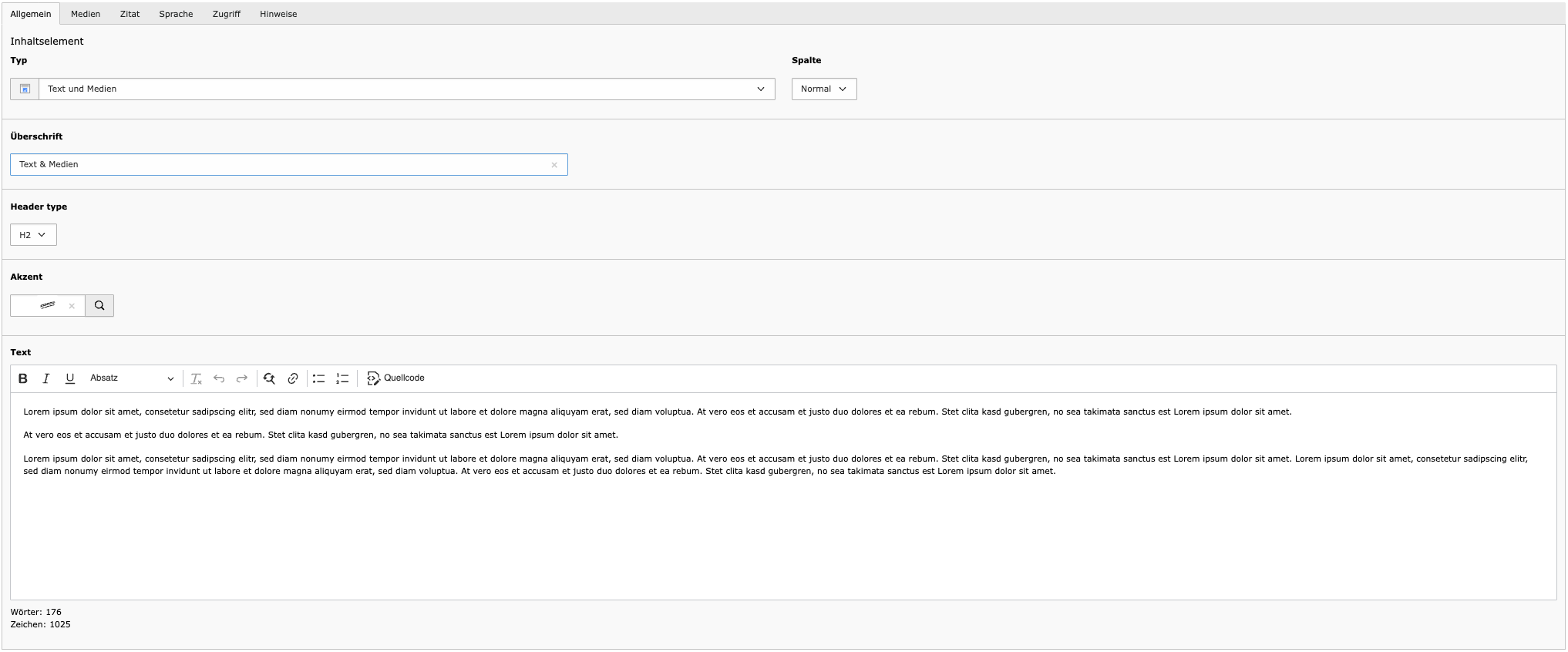 Das Element „Text und Medien" ist das vielseitigste Inhaltselement der Website. Es kombiniert Überschriften, Fließtext, Bilder und Zitate in einem einzigen Element und eignet sich für redaktionelle Seiten, Artikeltexte oder ausführliche Inhaltsbereiche.