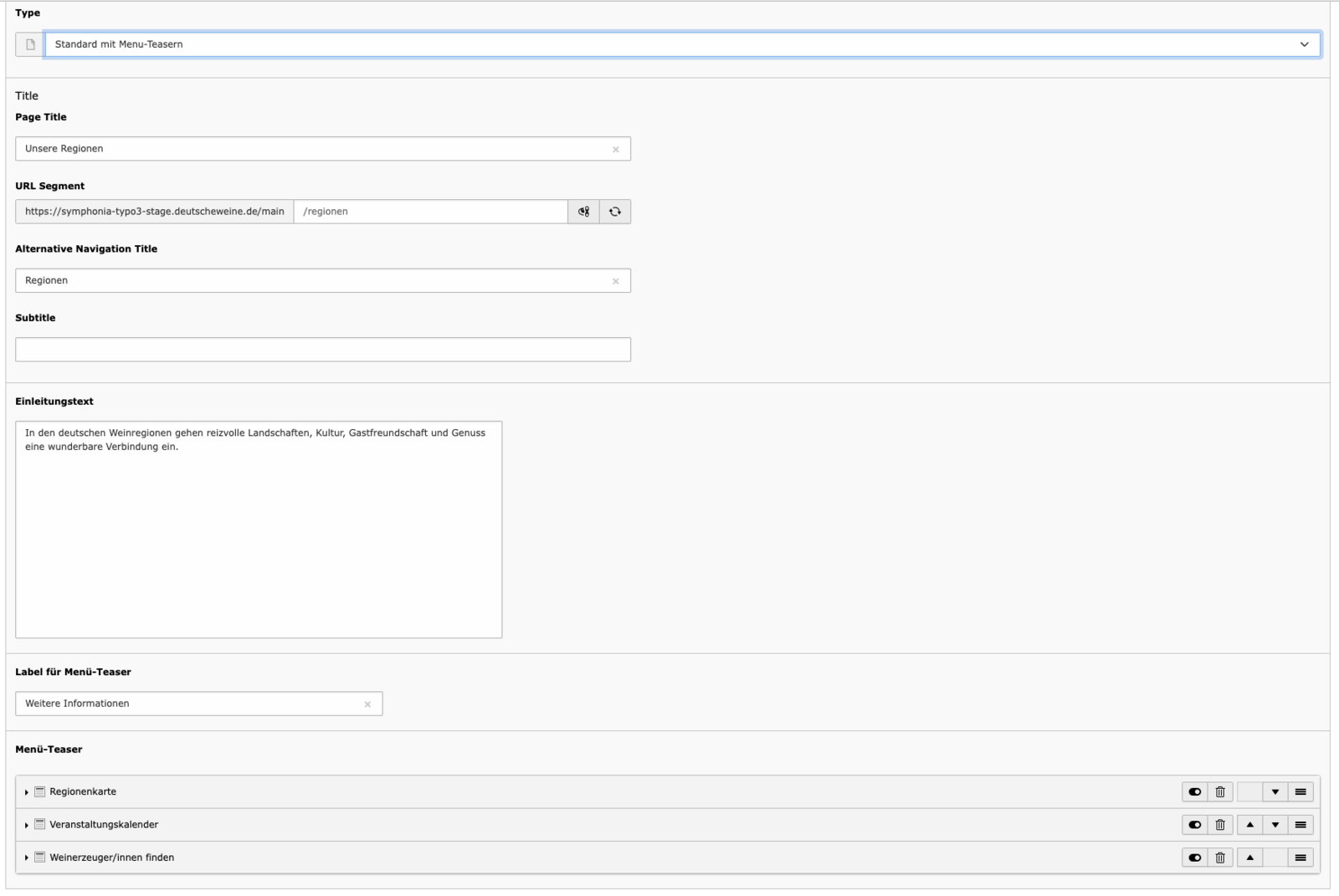- Label – Ein kurzer Hinweistext, der oberhalb der Überschrift erscheint (z. B. „Für Weinerzeuger", max. 40 Zeichen)