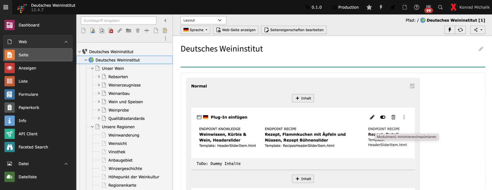 In diesem Modul können Sie die Seiten anlegen, bearbeiten und löschen. Im Arbeitsbereich können Sie außerdem Inhaltselemente auf den jeweiligen Seiten anlegen, bearbeiten und löschen.