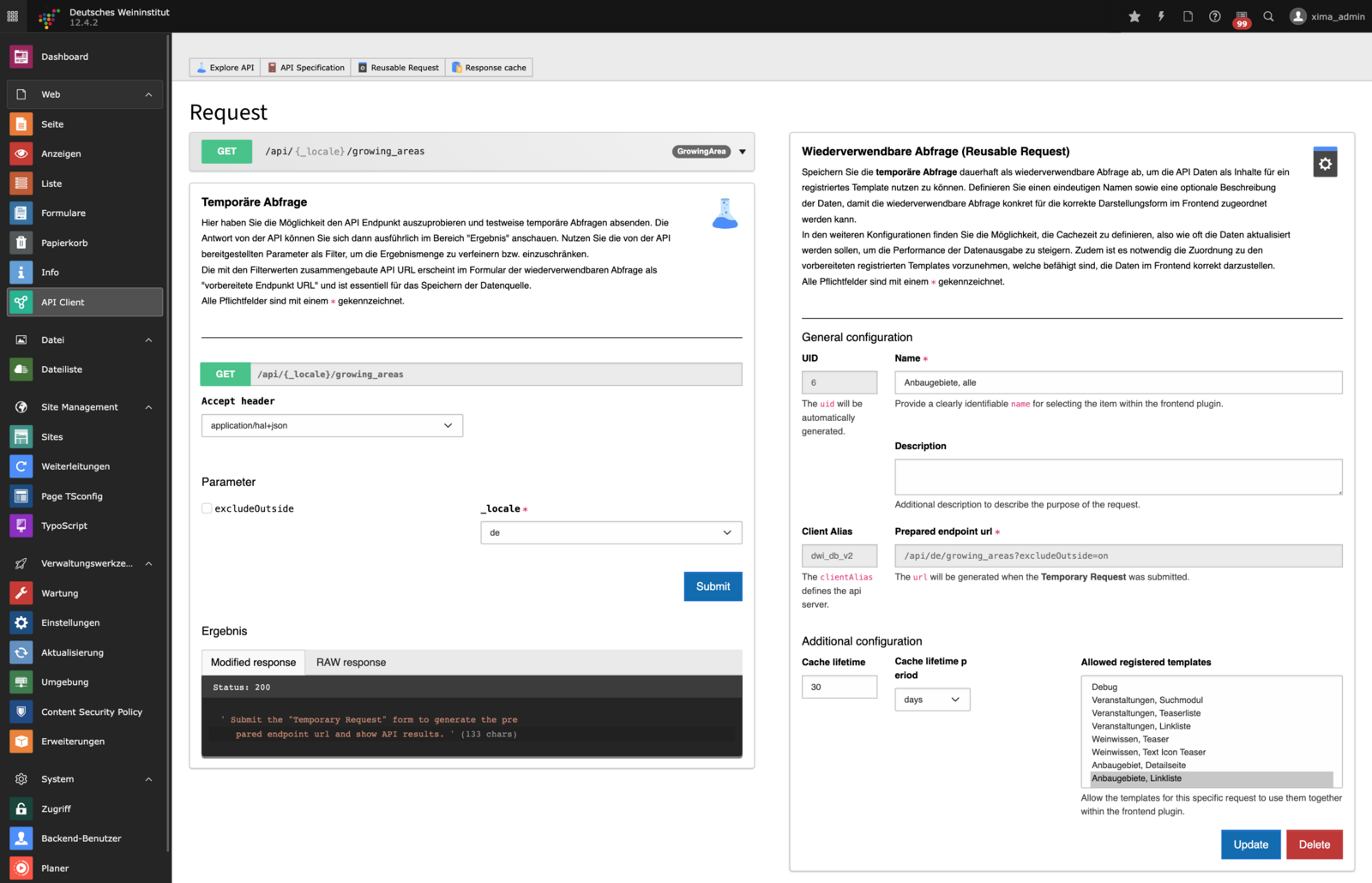 Im linken Bereich des Backends befindet sich die Modulliste. Hier wird der gewünschte Arbeitsbereich ausgewählt. Die Module sind unterteilt in Haupt- und Untermodule.