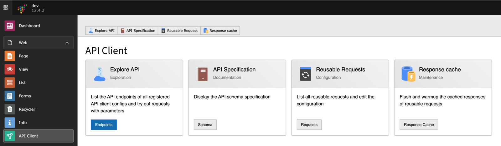 Die Kopfleiste stellt verschiedene Funktionen und Informationen bereit. Über das Kachel-Icon auf der linken Seite können Sie die Modulansicht auf- und zuklappen. Im zugeklappten Zustand sind nur die Symbole der jeweiligen Module zu sehen. Im Bereich mit dem TYPO3 Logo wird der Name der Webseite und die verwendete TYPO3 Version angezeigt (im Beispielbild DKFZ Intranet TYPO3 Version 11.5.16). Auf der rechten Seite finden Sie folgende Funktionen in der Kopfleiste: