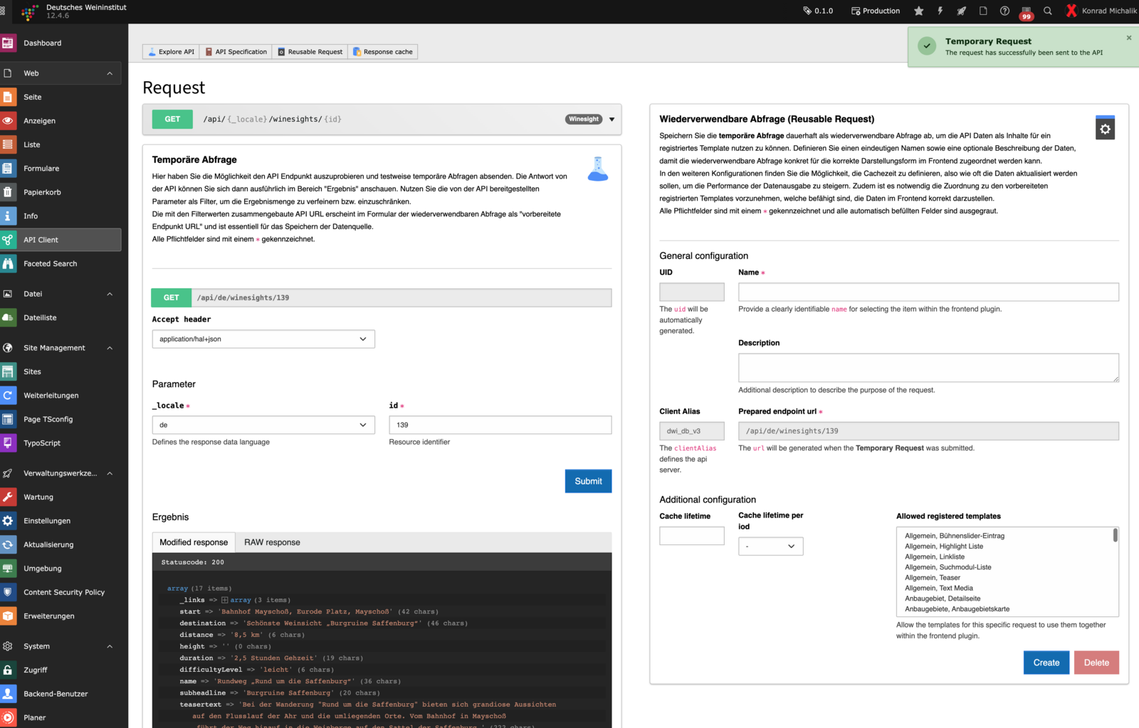 Je nach Ihren Benutzerrechten können Sie hier mit Klick auf Ihren Namen die Benutzereinstellung öffnen.Suche, mit welcher Sie im gesamten System nach Seiten, Inhaltselementen, Dateien oder Datensätzen suchen können.