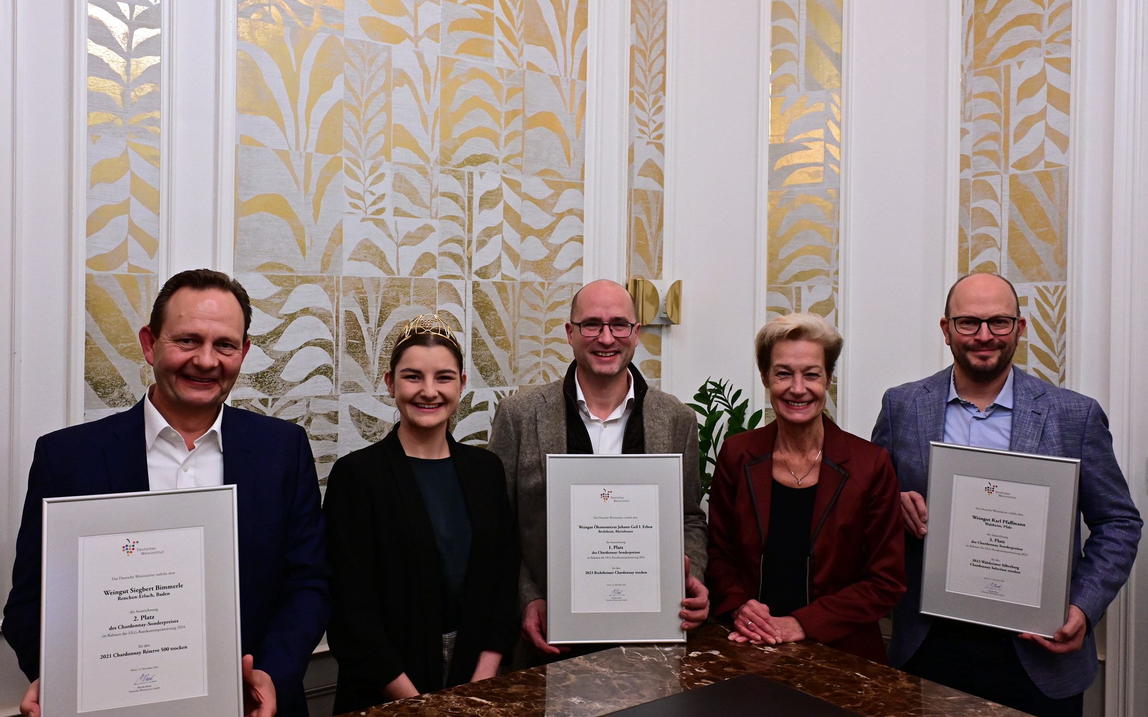 Der Siegerwein des diesjährigen Wettbewerbs, ein 2023er Bechtheimer Chardonnay trocken, stammt vom rheinhessischen Weingut Ökonomierat Johann Geil I. Erben. Den zweiten Rang erzielte das Weingut Siegbert Bimmerle aus der Ortenau in Baden, mit seinem 2021er Chardonnay Réserve 500 trocken. Platz drei ging an das Weingut Karl Pfaffmann im pfälzischen Walsheim für den 2023er Walsheimer Silberberg, Chardonnay Selection, trocken.
